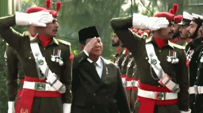A contingent representing the three services of Pakistan’s armed forces presented the guard of honour, which President Subianto inspected.