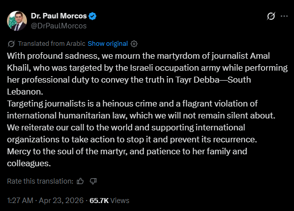 Information Minister Paul Morcos stated that Khalil was deliberately targeted by Israeli forces while carrying out her work. He condemned the incident, calling attacks on journalists a serious crime and a clear breach of international humanitarian law.