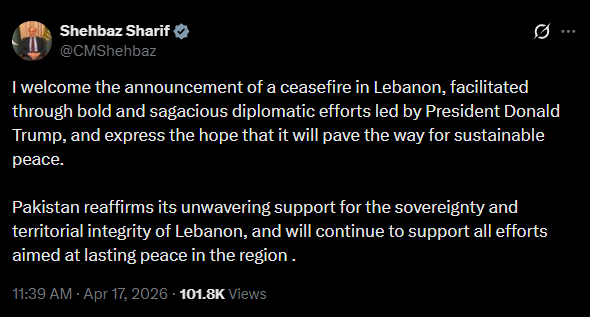 Mazaj News (Web Desk) Prime Minister Shehbaz Sharif has welcomed the announcement of a ceasefire between Lebanon and Israel.